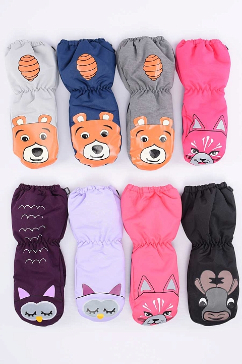Варежки болоньевые утепленные синтепоном и мягким подкладом. Температура эксплуатации -30/+5 гр.С. Рисунок у варежек разный, смотрите фото.