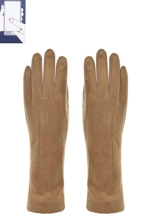 Перчатки жен. утепленные на плюше, ладонь - трикотаж, сверху - иск.замша. Длина 29 см. Нашивка на кончике указательного пальца позволяет пользоваться сенсорным экраном, не снимая перчаток.