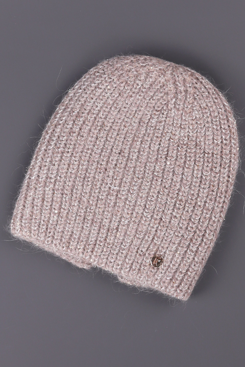 Шапка женская двойная, выполнена из пряжи "Angora" с добавлением нити люрекса и разрезом по заднему шву. Вязка плотная, эластичная.